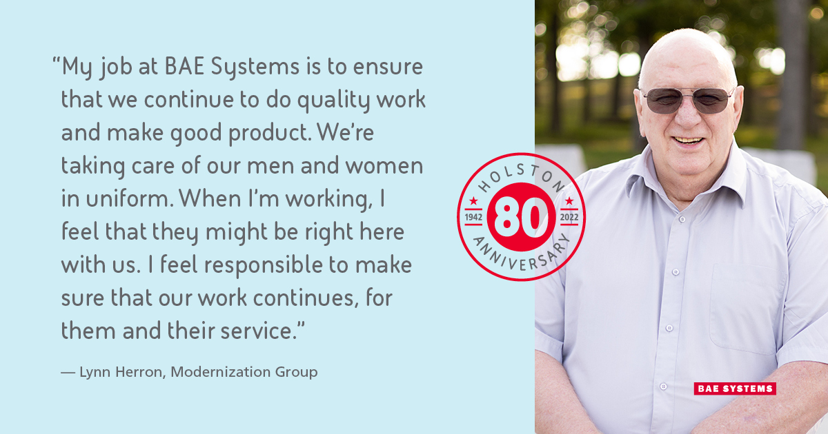 “My job at Holston is to ensure that we continue to do quality work and make good product. Those efforts allow us to take care of our men and women in uniform. When I’m working, I feel that they might be right here with us. I feel responsible to make sure that our work continues, for them and their service.”
