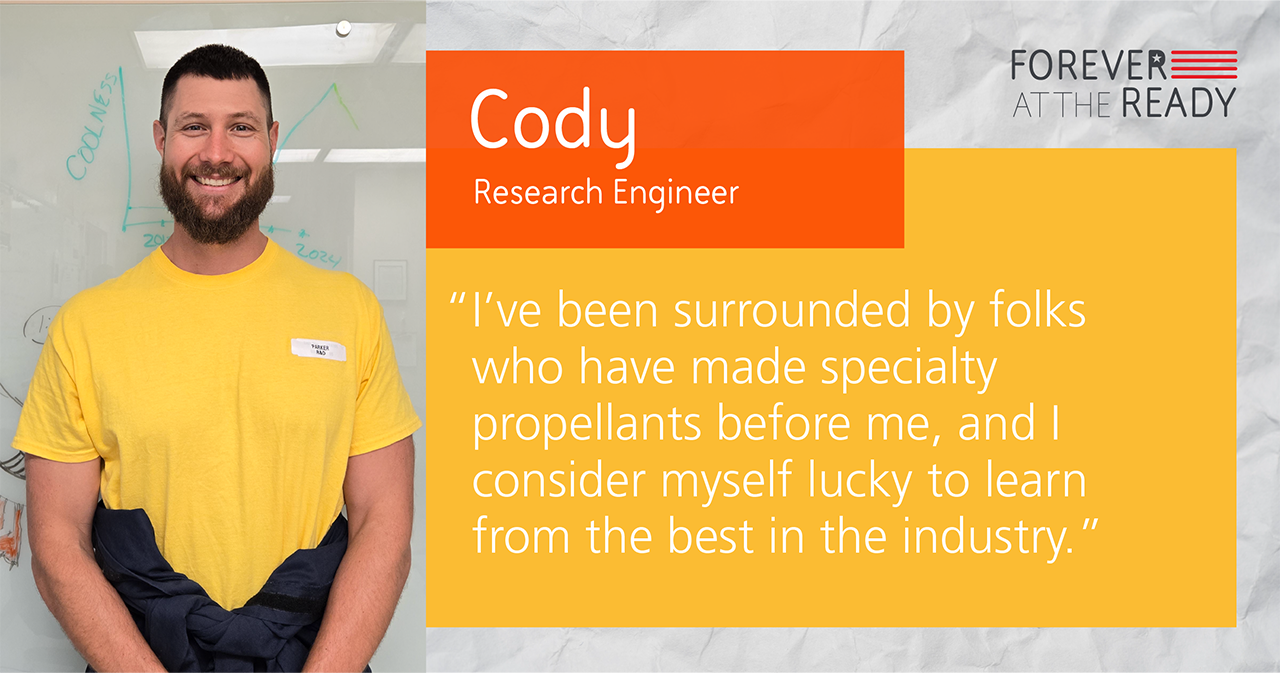 Cody takes immense pride in his job and holds his team to the highest standards to produce the safest product possible. These propellants are used for Cartridge Actuated/ Propellant Actuated Devices (CADPAD) such as canopy removers, ejection seats, and various space applications. As someone with a military-strong family, Cody knows how important it is that his loved ones, our country’s Warfighters, stay safe.
