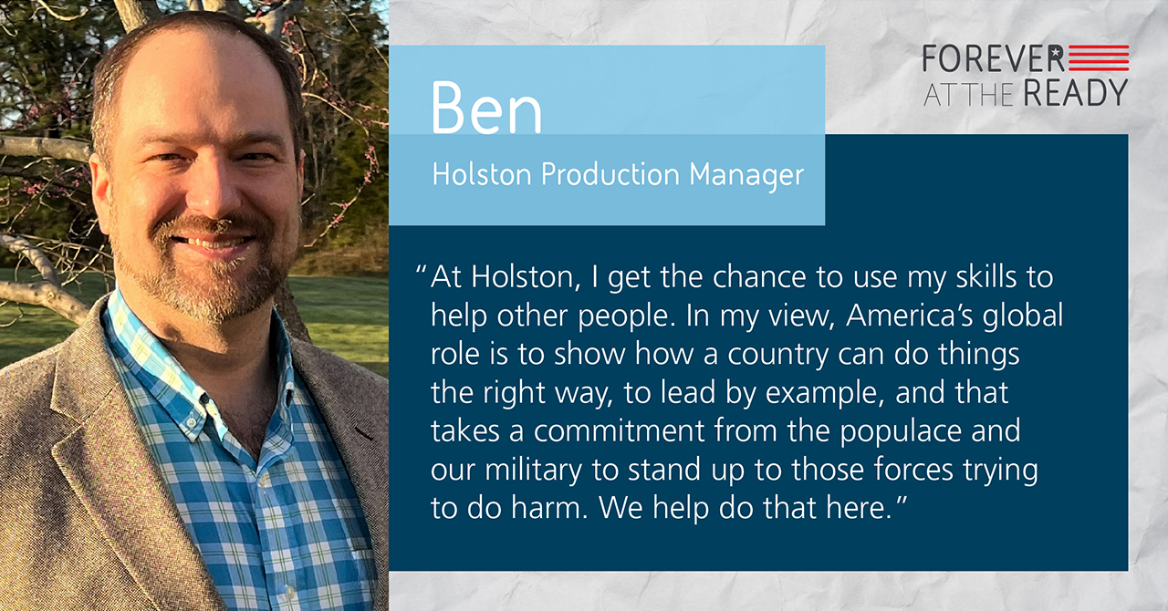 “At Holston, I get the chance to use my skills to help other people. In my view, America’s global role is to show how a country can do things the right way, to lead by example, and that takes a commitment from the populace and our military to stand up to those forces trying to do harm. We help do that here.”