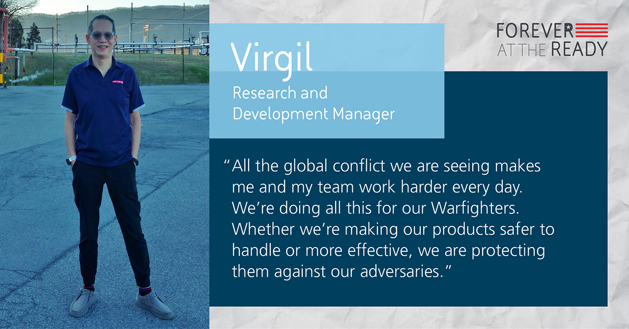 In the 1990s, Virgil Fung sought chemical engineering opportunities and noticed a “wanted” ad in his college’s career office. He applied for a job with BAE Systems (then known as British Aerospace Royal Ordnance) in Glascoed, Wales. While his role and location have changed, he has stayed with the company for nearly three decades. Virgil answered a wanted ad but found a life calling.