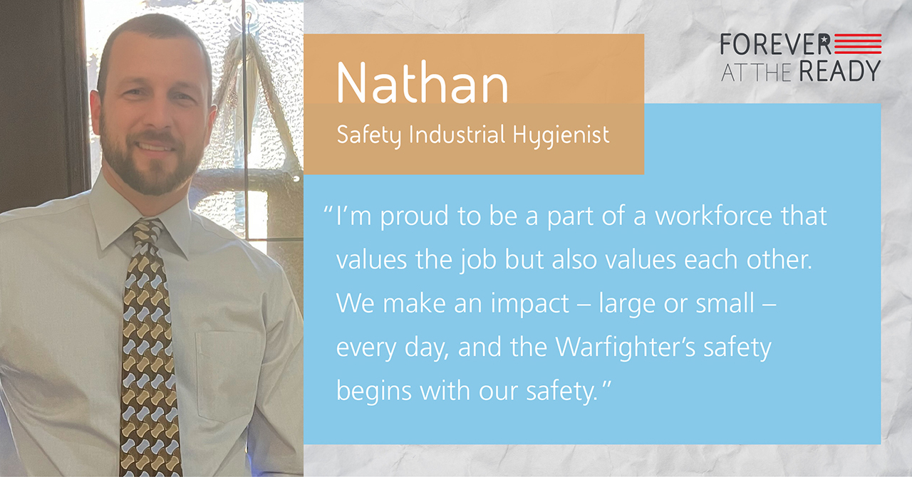 “There is not much room for error in our work, and I’m proud to be a part of a workforce that values the job but also values each other. We make an impact – large or small – every day, and the Warfighter’s safety begins with our safety.”