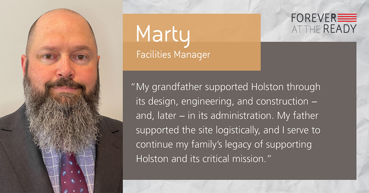 Marty is a Facilities Manager at the Holston Army Ammunition Plant (HSAAP), and his journey at Holston is all about continuing his family’s legacy. His grandfather obtained an engineering degree from Emory & Henry College and was the first in his family to do so. When World War II broke out, and the Allies needed an answer to defeat German U-Boats, Marty’s grandfather was part of the team from the Tennessee Eastman Corporation, who designed and operated the Great Holston Ordnance Works, (now HSAAP). Marty’s grandfather served in several engineering and management roles before becoming the assistant to the site’s General Manager, where he stayed until his retirement in 1971 with the Holston Defense Corporation (HDC), a former operating contractor. Following his retirement, he worked at HSAAP as a sub-contractor for HDC for an additional seven years, serving as an advisor.