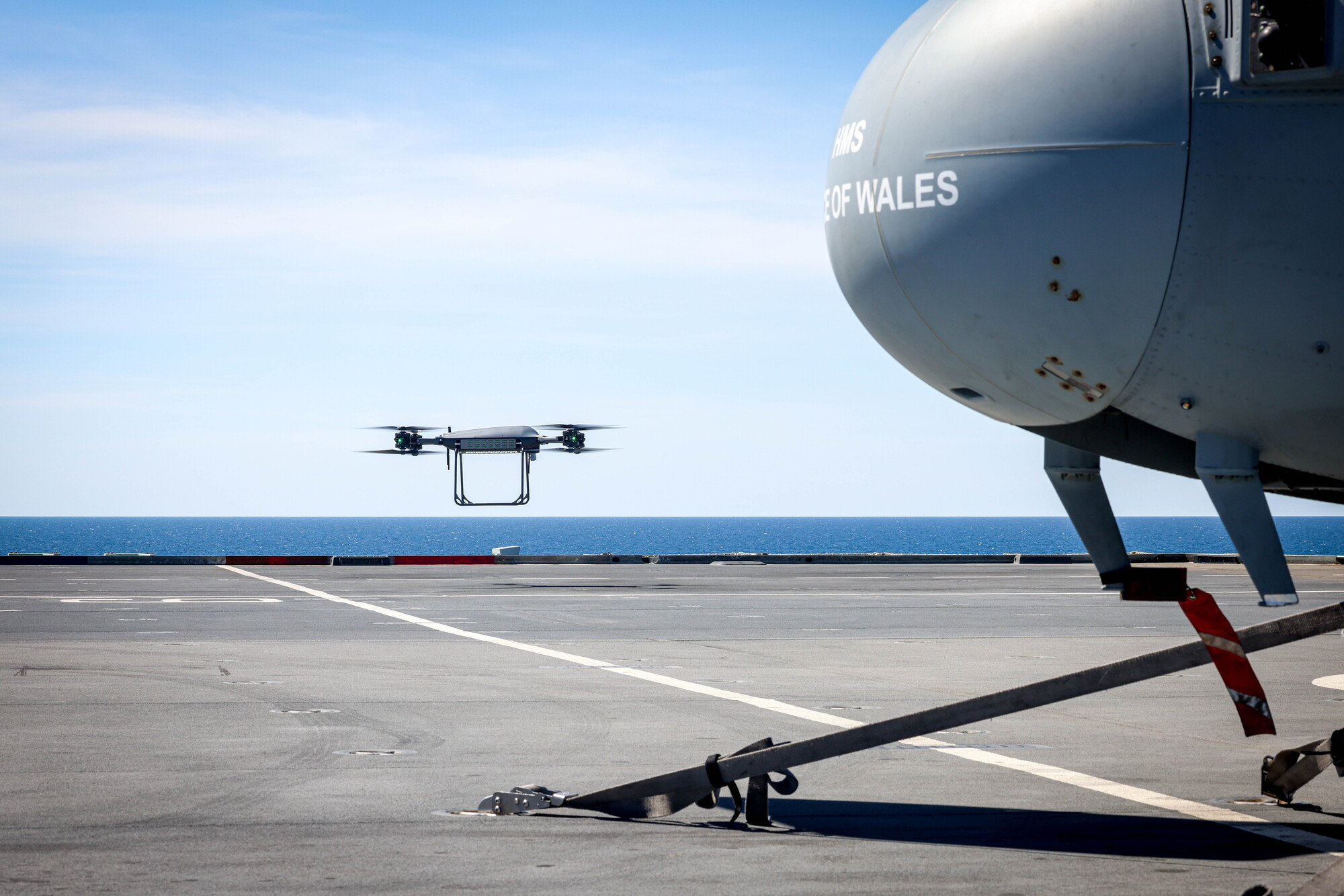 As HMS Prince of Wales and her escort warships made for port visits in Japan, the Malloy T-150 – an eight-bladed system operated by a crew of two able to carry up to 68kg and fly up to 60mph – was launched as part of a trial by 700X Naval Air Squadron.