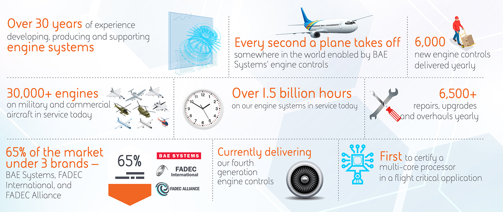 We’re backing our investments with deep industry knowledge and expertise. Our first-generation engine controls took flight in the early 1990s and have logged 1.5 billion flight hours. Today, our engine controls are on more than 30,000 aircraft around the world. We stand by those products from the moment they leave our production factory until their last day of service. Our aftermarket support maintains the technology through its full lifecycle and keeps planes flying safely.