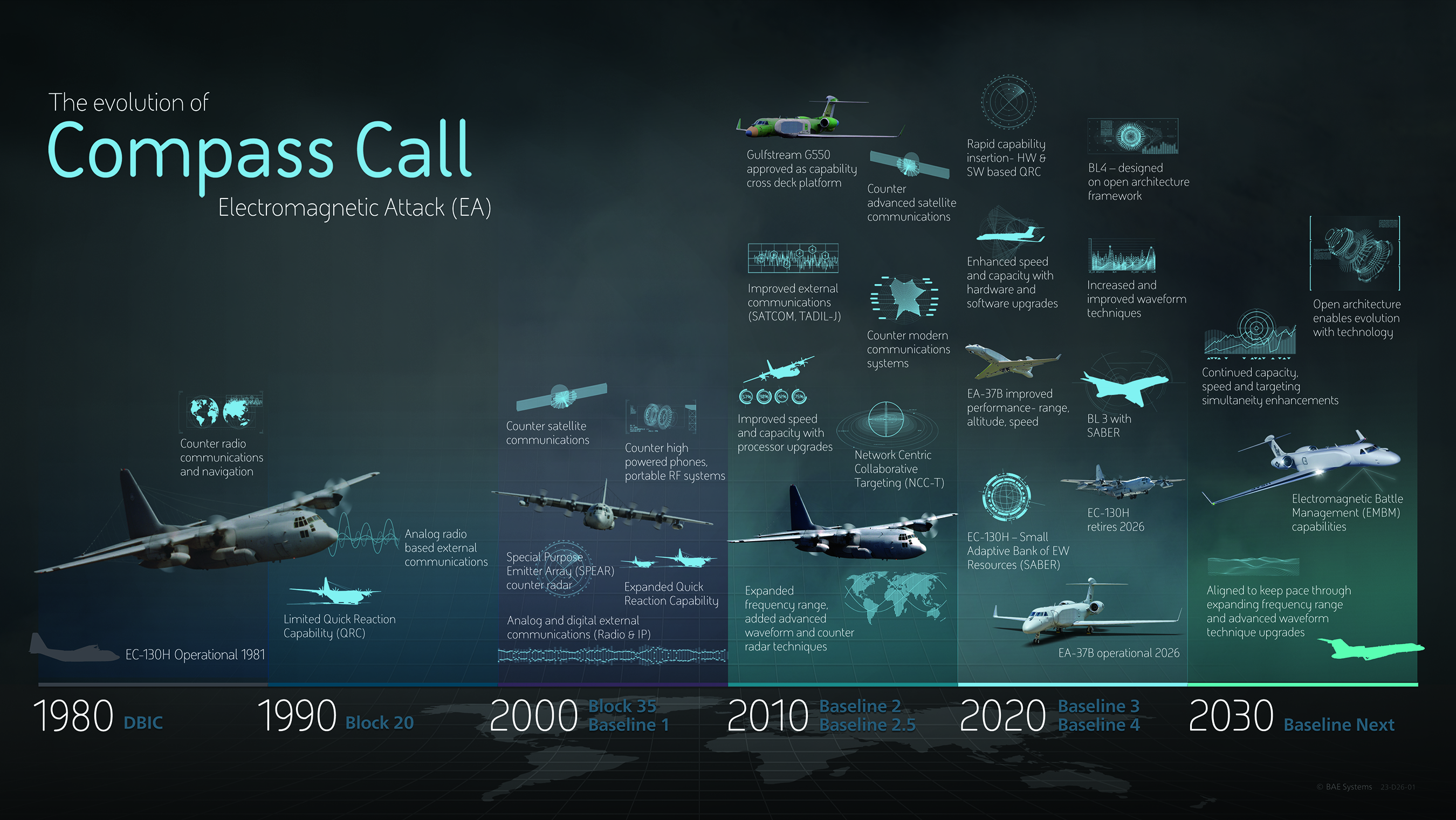 Compass Call is a tactical airborne electromagnetic attack weapon system that denies, degrades and disrupts adversary command, control, communications, radars, and navigation systems to restrict enemy electromagnetic-based battlespace coordination. The weapon system neutralizes enemy air defenses by preventing the transmission of essential information between sensors, weapon systems and control networks. BAE Systems serves as the mission system engineering, integration, and testing lead as well as the mission system prime contractor.